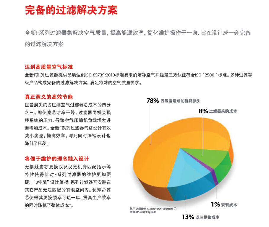 壓差損失約占壓縮空氣過濾器總成本的四分之三。即使濾芯潔凈干燥,過濾器同樣會損耗系統(tǒng)的壓力,導(dǎo)致空氣壓縮機(jī)負(fù)載增大進(jìn)而增加成本。全新F系列過濾器氣路設(shè)計(jì)有效減小滿流,提高效率,與此同時深褶設(shè)計(jì)也降低了壓差。
